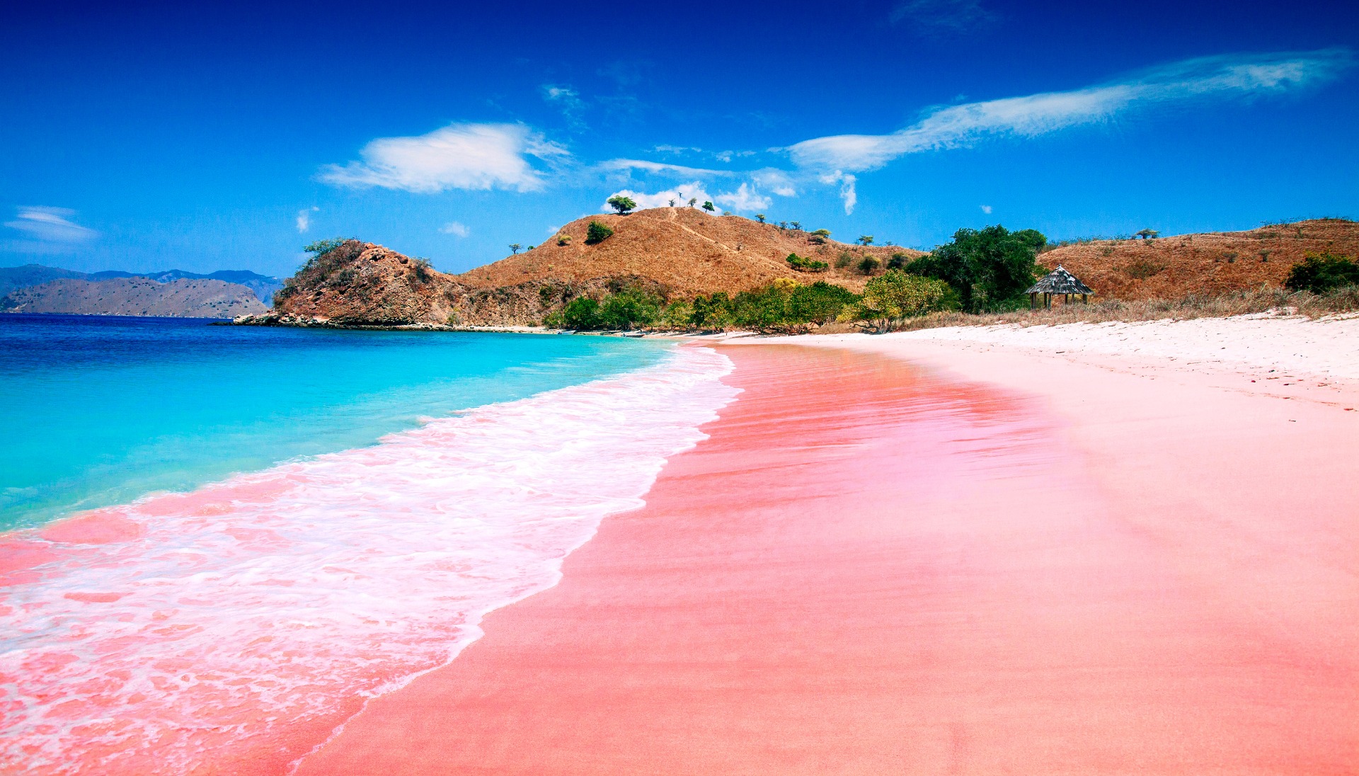 Komodo es una de las 17.508 islas de Indonesia, así como parte del famoso Parque Nacional de Komodo. Además de su playa rosada, la isla es mundialmente famosa como el hábitat del lagarto más grande del mundo: el dragón de Komodo. La playa de la isla es considerada una de las más bellas del mundo, con acantilados rocosos y arrecifes de coral sobre un fondo de arena rosa.